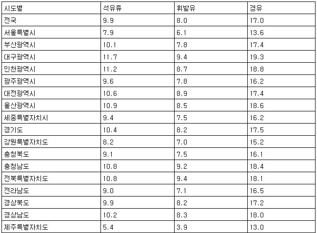 [표] 시도별 3월 석유류 전년 동월 대비 물가 상승률(단위: %)
