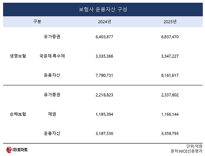 9일 NICE신용평가 통계 자료, 금융통계정보시스템에 따르면 지난해 말 기준 생명보험 업권은 전체 운용자산 816조1617억원에서 41.0%(334조7227억원)가 국공채와 특수채로 구성됐다. 같은 기간 손해보험은 운용자산 335조9793억원 중 34.7%(116조6144억원)가 채권이었다.