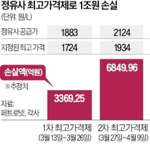 13일 한국경제신문이 최고가격제에 따른 정유 4사의 매출 예상 손실을 추정한 결과 1차(3월 13~26일) 3369억원, 2차(3월 27일~4월 9일) 6850억원으로 총 1조219억원에 달하는 것으로 집계됐다. 정유사의 석유 제품 공급가격을 그대로 판매 가격에 적용했을 때 얻을 수 있는 수익을 비교해 계산한 것이다. 업계에서는 정유사들이 국제 유가 상승분에 더해 배럴당 15~30달러 수준의 웃돈을 더 내는 만큼 실제 손해 규모는 이보다 더 클 것으로 보고 있다. 정부가 지원책을 마련할 예정이지만, 당분간 현금흐름이 막혀 정유사들의 자금조달 부담도 불가피해졌다.