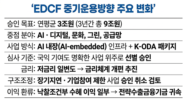 [대한경제=최지희 기자] 정부가 대외경제협력기금(EDCF)의 중장기 운용 방향을 전면 재편한다. 기존의 범용 인프라 지원 틀을 깨고 인공지능(AI)ㆍ문화ㆍ공급망으로 중점 분야를 압축하는 ‘선택과 집중’ 전략을 전면에 내걸었다. 향후 3년간 연평균 3조원, 총 9조원 규모 신규 사업을 승인한다는 목표도 명시했다.