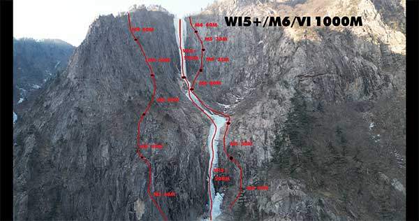 이 개념도는 신성훈씨가 그렸다. 기존 루트이자 현재 등반이 가능한 유일한 루트라고 할 수 있다. 토왕성폭포의 우벽과 좌벽은 과거 여름철 암벽등반 및 겨울철 믹스등반 대상지였다. 최근에는 여러 가지 이유로 등반이 되지 않았다. 지난 3월 14일(토) 블랙다이아몬드 도봉산점에서 열린 TIAD 다큐상영 및 보고회에서 알게 된 바에 따르면 약 5년 전 청죽산악회 심권식씨가 우벽에서 현재 그려진 것과 거의 흡사한 루트로 하켄을 사용해 등반했다. 신성훈씨는 이 외의 루트는 프로텍션 설치가 힘들고, 낙석의 우려가 있어 등반 가능성을 장담할 수 없다고 말했다.