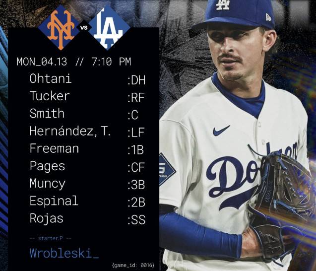 다저스는 이날 오타니 쇼헤이(지명타자)~카일 터커(우익수)~윌 스미스(포수)~테오스카 에르난데스(좌익수)~프레디 프리먼(1루수)~앤디 파헤스(중견수)~맥스 먼시(3루수)~산티아고 에스피날(2루수)~미겔 로하스(유격수) 순으로 선발 라인업을 꾸렸다.