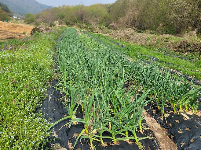| ▲ 마늘밭 숲길 옆으로 이어진 마늘밭, 산과 들이 맞닿은 자리에도 누군가는 심고 고향을 지킨다 |