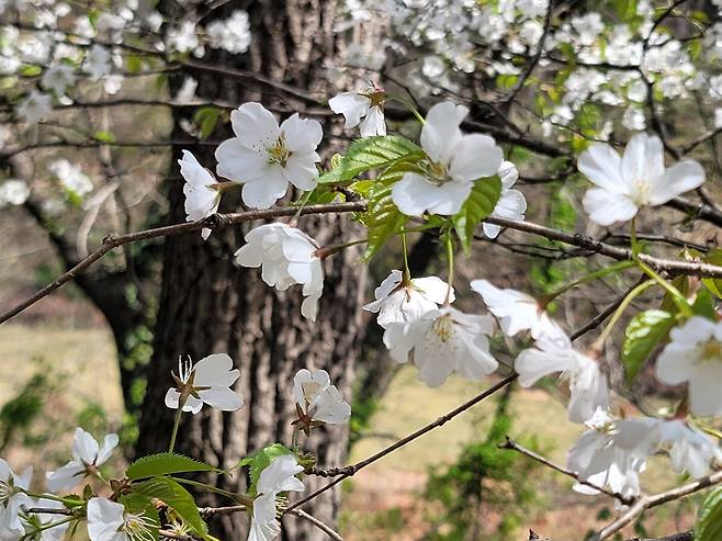 | ▲ 산벚 햇살에 스며든 산벚꽃 |