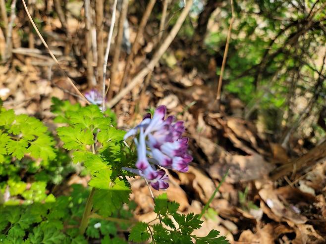 | ▲ 싸리길 숲 그늘 아래 피어난 자주괴불주머니 |
