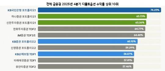 개인형IRP 수익률에서 두각을 보인 KB국민은행의 저력은 퇴직연금 디폴트옵션 시장에서 더 극적이다. 지난해 4분기 금감원 공시 기준 디폴트옵션 3년수익률(고위험·적극투자형 포트폴리오 기준)은 전체 금융권을 통틀어 'KB국민은행 디폴트옵션 적극투자형 포트폴리오1'이 74.25%로 1위를 차지했다. 2위 하나증권 포트폴리오1(65.73%)을 8.52%포인트 앞섰고, 3위 신한투자증권 포트폴리오1(65.26%)도 9%포인트 가까이 따돌렸다.