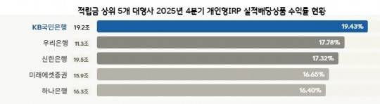 전체 IRP 수익률 순위는 DB손해보험(27.85%, 적립금 164억 원), BNK부산은행(25.85%, 적립금 7140억 원), iM뱅크(옛 대구은행, 25.05%, 적립금 4937억 원) 등 중소형사들이 상위권을 차지했다. 중소형사는 적립금이 100억~7000억 원대에 불과해 수조~수십조 원의 자금을 굴리는 대형사와 운용환경 자체가 다를 수 밖에 없다. 결국 IRP 시장에서의 진짜 싸움은 대형사 사이에서 벌어지는데 그 경쟁에서 KB국민은행이 우위에 서있는 셈이다.