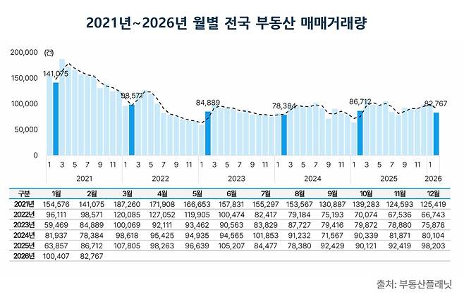 14일 부동산 종합 플랫폼 기업 부동산플래닛에 따르면 올해 2월 전국 부동산 시장은 매매 거래량은 8만2767건으로 전월(10만407건) 대비 17.6% 줄었다.