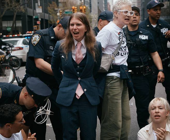 [뉴욕=AP/뉴시스] 13일(현지 시간) 미국 뉴욕의 척 슈머 상원의원 사무실 앞에서 반전 단체 ‘유대인 평화의 목소리’가 주도한 반전 시위에 참여한 전 미군 정보분석가이자 위키리크스에 기밀을 폭로했던 첼시 매닝이 경찰에 체포되고 있다. 이날 시위 참가자 약 100명이 체포된 가운데 주최 측은 이번 행동이 슈머 의원과 커스틴 질리브랜드 상원의원으로 하여금 미국 폭탄의 이스라엘 판매를 중단하는 법안을 지지하도록 압박하려는 것이라고 설명했다. 2026.04.14.