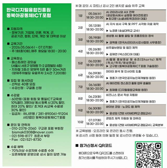 한편 이번 '제6기 생성형 AI와 AI에이전트 활용 심화 교육' 외에 시니어 등을 위한 'AI기본 과정'도 새로 마련, 시행한다. 'AI기본 과정'은 5월14일부터 6월11일까지 매주 목요일 오후 4시부터 7까지 포럼 교육장에서 진행한다. 기초부터 차근차근 실습위주로 이뤄진다. 수강료는 40만원이다. 선착순 15명까지 모집한다.