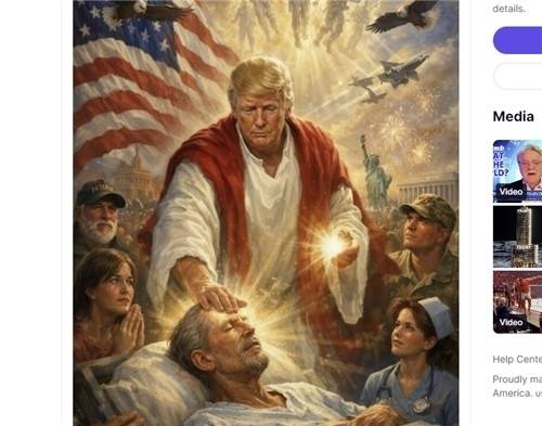 트럼프 대통령은 일요일인 현지시간 지난 12일 밤 소셜미디어 트루스소설에 흰 옷을 입고 붉은 망토를 걸친 채 병든 누군가의 이마에 오른손을 올린 자신의 이미지를 올렸습니다.