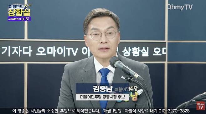| ▲ 김중남 더불어민주당 강릉시장 후보가 13일 오마이TV '이병한의 상황실'과 인터뷰하고 있다. |