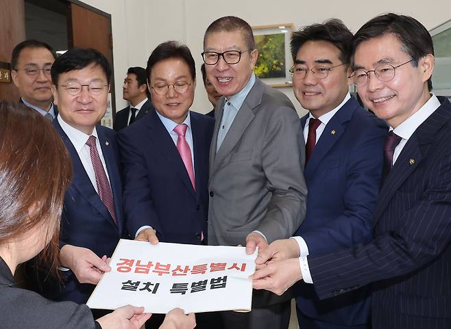 이날 두 광역단체장과 이성권(부산 사하갑)·조경태(사하을)·정점식(경남 통영고성)·강민국(진주을) 등 부산경남 지역 국민의힘 국회의원들은 "대한민국 지방분권형 행정통합의 새로운 표준이 될 것"이라며 '경남·부산 통합특별시 설치 및 경제·산업수도 조성을 위한 특별법'을 국회 의안과에 제출했다.