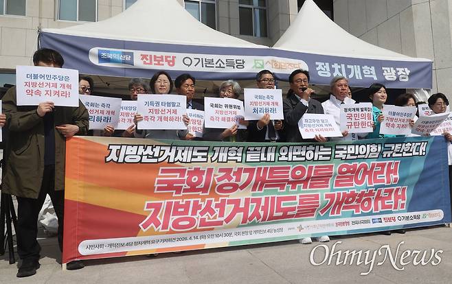 이날 오전 10시 30분부터 서울 영등포구 국회 본관 앞 정치개혁 광장(농성장)에서 열린 진보4당과 시민사회단체의 지방선거제도 개혁 요구 기자회견에서 '정치개혁'에 미온적인 민주당을 향한 실망의 목소리가 터져나왔다.