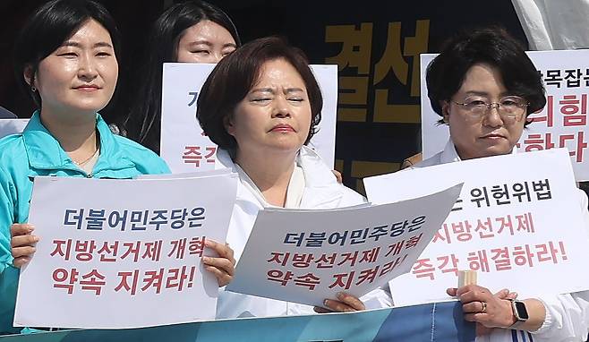 그러면서 "그 결과 지방자치의 다양성을 높이기 위한 기초·광역의회의 중대선거구 확대는 기득권 양당인 민주당과 국민의힘이 합의하는 지역에만 최소한으로 추진하려 한다. 비례대표 비율 상향 역시 개혁·진보4당이 최소 수준으로 요구한 20%에 턱없이 미치지 못한 수준에서 흉내만 내려 하고 있다"고 밝혔다.