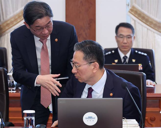 | ▲ 정성호 법무부 장관(오른쪽)과 이억원 금융위원장이 14일 청와대에서 열린 이재명 대통령 주재 국무회의 겸 비상경제점검회의에서 대화하고 있다. |