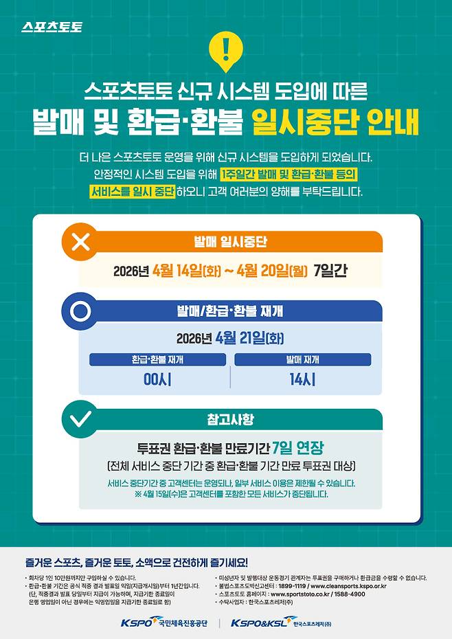서울올림픽기념국민체육진흥공단이 발행하는 체육진흥투표권의 수탁사업자 한국스포츠레저가 신규 시스템 도입을 위해, 2026년 4월 14일 오전 0시부터 4월 20일 밤 12시까지 7일간 발매 및 환급·환불 서비스를 일시 중단한다고 밝혔다.