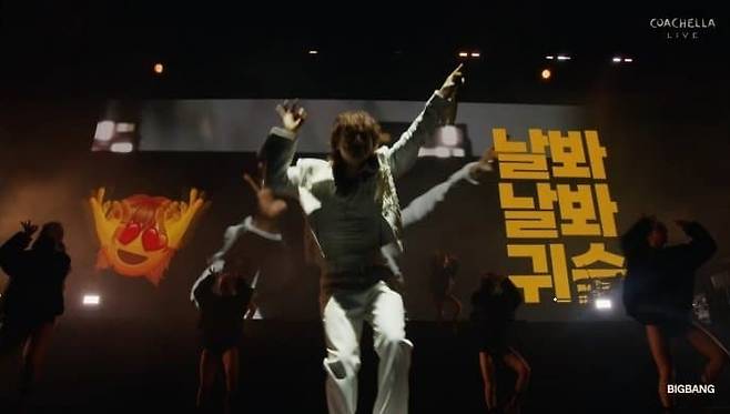 이달 10~19일 열리고 있는 코첼라는 20만~30만 명의 관객이 운집하는 미국 최대 규모 음악 축제다. 올해는 빅뱅 외에도 다채로운 K팝 가수들이 출연진 명단에 올랐다. 지난 11일 가수 태민은 한국 남성 솔로 가수로는 처음으로 단독 공연했고, 10일에는 '케이팝 데몬헌터스'의 그룹 헌트릭스(이재, 오드리 누나, 레이 아미)가 K팝 합작 그룹 캣츠아이와 함께 합동 무대로 '골든'을 열창했다. 빅뱅은 오는 19일 한 차례 더 코첼라에서 무대를 갖는다. 해당 무대는 유튜브로 전 세계에 생중계될 예정이다.