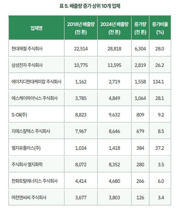 ‘100만톤 클럽’ 중 배출량이 가장 많이 늘어난 기업은 현대제철, 삼성전자, 에이치디현대케미칼, 에스케이하이닉스, 에쓰오일 등의 순서로 나타났다. “업종으로 보면 석유화학, 정유, 반도체를 중심으로 배출량이 증가했다”고 연구팀은 짚었다. 2018년 대비 증가율을 기준으로 하면 에이치디현대케미칼(134.1%), 엘지유플러스(37.2%), 에스케이하이닉스(28.1%), 현대제철(28%), 삼성전자(26.2%) 등의 순서로 나타났다. 연구팀은 “반도체 업종인 삼성전자와 에스케이하이닉스의 경우 절대 배출량은 계속 늘었지만, 제품 생산에 따른 ‘탄소집약도’는 하락하는 추세”라며 “이는 두 기업이 배출저감 노력을 기울이고는 있지만, 반도체 호황과 공장 증설에 따른 전체 생산량 증가 폭이 감축 속도를 앞질렀음을 의미한다”고 분석했다.