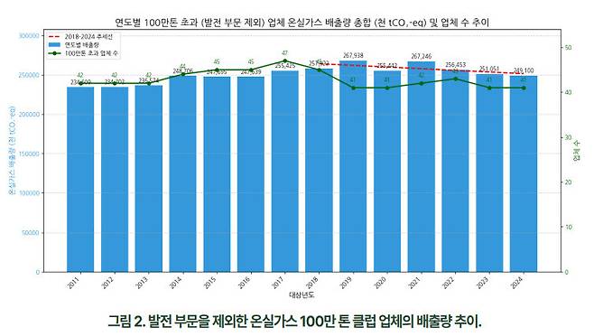 2018년과 2024년을 비교했을 때, 온실가스를 가장 많이 줄인 5개 업체는 모두 발전 부문 기업들로 나타났다. 연구팀은 “정부의 전력수급기본계획에 따라 노후 석탄화력발전소가 단계적으로 폐지되고, 액화천연가스(LNG)와 재생에너지로의 전환이 추진된 결과”로 풀이했다. 반면 “산업 부문의 배출량은 겉으론 감소세를 보이지만, 발전 부문을 제외하면 민간 기업의 자발적 감축 성과는 아직 미미하다”고 평가했다. 발전 부문을 제외한 ‘100만톤 클럽’ 41개 기업 가운데 배출량을 가장 많이 줄인 기업은 엘지디스플레이, 포스코, 서울특별시 등으로 나타났다.