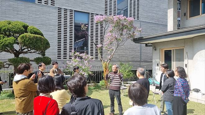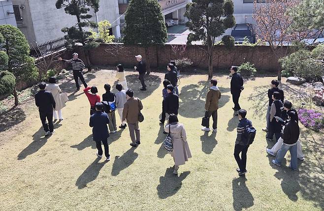 | ▲ 4월 오마이포럼 참가자들이 11일 오후 서울 마포구 서교동 오마이뉴스 마당집에서 오연호 대표의 안내로 정원을 둘러보고 있다. |