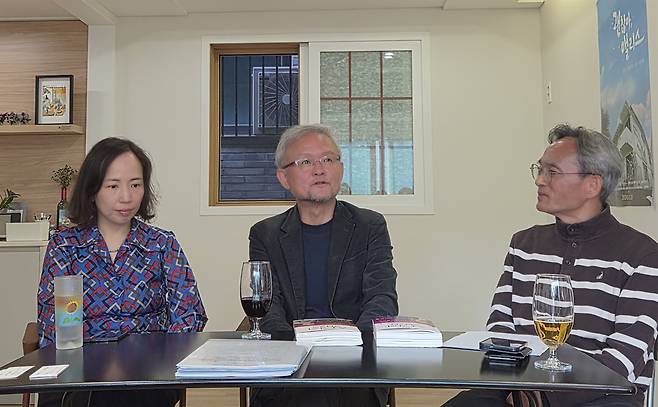 | ▲ 지난 11일 오후 서울 서교동 오마이뉴스 마당집에서 열린 오마이포럼에서 최문정 교수, 박태웅 분과장, 오연호 대표(왼쪽부터)가 종합토론하고 있다. |