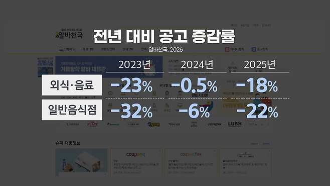 영업시간 감소나 인구 감소 등 여러 변수가 있을 수 있겠지만, 최근 3년 동안 일반음식점 그리고 외식·음료 분야에서의 채용 공고가 줄어들었다는 통계(알바천국, 2026)도 나왔습니다.