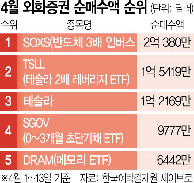 반도체 3배 인버스 ETF(SOXS)와 초단기채(SGOV)가 순매수 상위에 오른 모습은 이례적이다. 실제 올해 1~3월까지 해외주식 순매수 순위에서 SOXS는 48위(7817만 달러·약 1157억 원), SGOV는 28위(1억 3127만 달러·약 1943억 원)에 그쳤다. 3월 한 달간 롤러코스터 장세를 겪은 투자자들이 폭락장을 내다봤다는 분석이 이어진다.