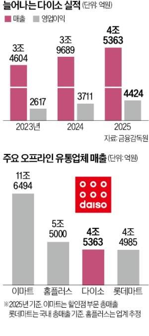 연매출 4조5000억원을 넘기며 다이소는 국내 매출 기준으로 롯데마트를 추월했다. 지난해 롯데마트의 해외 매출을 제외한 국내 매출은 4조4985억원이었다. 2024년까지 다이소와 롯데마트의 국내 매출 규모는 5000억원 이상 차이가 났다. 2위인 홈플러스와의 격차도 좁혔다.