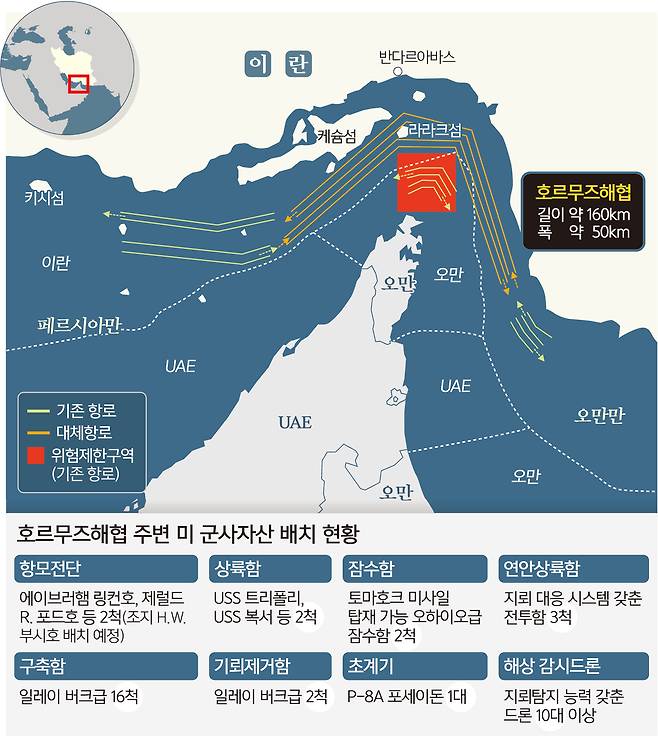 미군의 이번 봉쇄작전에서 핵심 전력은 강습상륙함 트리폴리(LHA-7)다. F-35B와 스텔스 전투기, 수직이착륙기 등을 탑재하고 있다. 미국 항공모함 USS 조지 H. W. 부시함과 미 해군의 어벤저급 소해함(기뢰를 찾아 제거하는 함정) 두 척도 중동으로 향하고 있는 것으로 알려졌다.