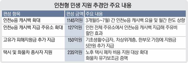 우선 인천시는 인천e음 캐시백 한시적 증액에 1천145억원을 편성하고자 한다. 인천시는 매달 결제 금액 30만원까지 캐시백을 지급하고 있는데, 다음 달부터 오는 7월까지 3개월간은 이 한도를 50만원까지 늘릴 계획이다. 이 기간 캐시백 요율도 10%에서 20%로 높아진다. 매달 최대 3만원 지급되던 캐시백이 10만원까지 늘어난다.