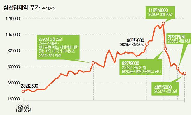 올 들어 지난 3월 30일까지 5배(400%) 치솟으며 코스닥 시가총액 1위에 올랐던 삼천당제약 주가는 기자회견 직후에도 급락했다. 지난해 말 종가 기준 23만2500원이었던 삼천당제약 주가는 지난 3월 30일 118만4000원까지 치솟아 종가 기준 신고가를 갈아치웠다. 이후 ▲15조원 규모 계약 의구심 ▲한 블로거의 주가 조작 의혹 제기 ▲기술력 논란 등 숱한 의혹에 휘말려 주가는 50만원대로 곤두박질쳤다.