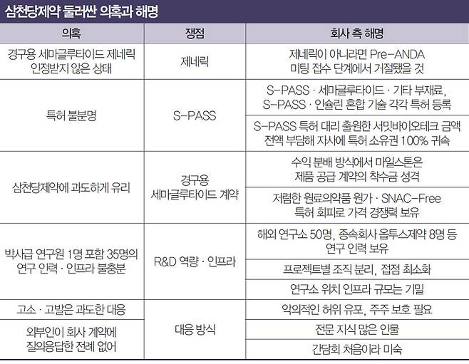 그럼에도 삼천당제약이 계약 파트너사를 공개하지 않은 점은 찜찜한 대목이다. 전 대표는 “특허는 등록되는 순간부터 모방의 위험이 따른다”며 “숨기는 것이 아닌 삼천당제약의 경쟁 전략”이라고 항변했다.