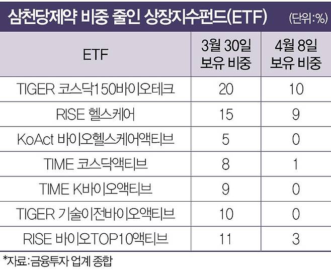 운용 업계 관계자는 “개별 종목의 가격 발견이 충분히 이뤄지지 않은 상태에서 ETF 자금이 시총 상위 종목에 집중됐다. 삼천당제약 주가는 기업가치의 결과라기보다 수급 구조의 산물로 봐야 한다”고 지적했다.