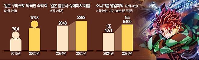 슈에이샤에는 또 다른 대작이 있다. 글로벌 히트작 귀멸의 칼날이다. 세계 발행 부수가 2억2000만 부를 넘은 귀멸의 칼날은 애니메이션 영화로 제작되며 영화판까지 뒤흔들었다. 지난 9일 일본 내 상영이 종료된 ‘귀멸의 칼날: 무한성편 제1장’은 전 세계에서 1179억엔의 흥행 수입을 올렸다. 일본 영화 사상 처음으로 흥행 수입 1000억엔을 돌파하며 역대 1위를 기록했다. 세계 누적 관객은 9852만 명으로, 일본 밖에서 7106만 명이 몰려 해외에서만 777억엔을 벌어들였다.