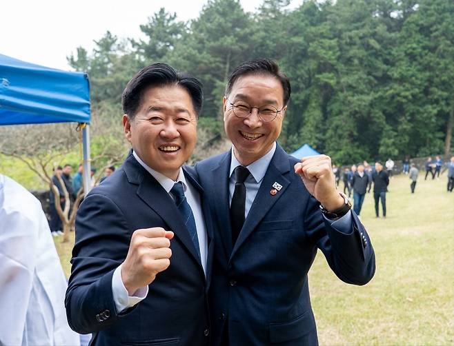 | ▲ 오영훈 제주도지사가 경선 탈락 후 복귀 전날인 지난 12일 SNS에 위성곤 후보와 어깨동무를 한 사진을 게재하며 "진짜 일꾼"이라고 치켜세웠다. |