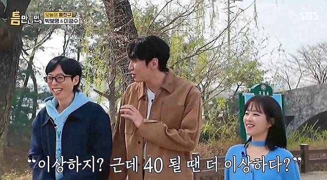 이를 들은 유재석은 "좀 다르다"고 말하며 "광수도 20대 때 만났는데, 40살이 넘었다니 믿기지 않는데"라고 했다. 이광수는 "그때가 생생하게 기억난다. 내가 30살이 될 때 형한테 '기분이 이상해요'라고 했는데, 형이 '이상하지? 40살 될 땐 더 이상하다'라고 했던 게 깅거난다"고 떠올렸다.