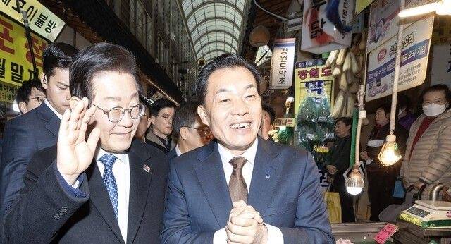 | ▲ 이재준 수원특례시장(오른쪽)이 이재명 더불어민주당 대표(왼쪽) 등과 함께 2024년 11월 21일 수원 전통시장을 방문해 상인들을 격려하고 애로사항을 들었다. |