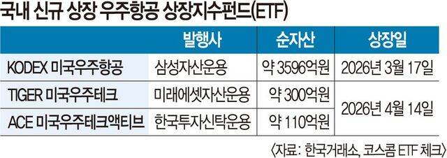 국내 자산운용업계도 우주항공 투자 수요를 선점하기 위해 ETF 출시 경쟁에 나섰다. 미래에셋자산운용과 한국투자신탁운용은 이날 각각 ‘TIGER(타이거)미국우주테크’, ‘ACE(에이스)미국우주테크액티브’를 상장했다. 첫날 수익률은 각각 5.50%, 3.66%를 기록했다. 순자산은 약 300억원, 110억원이 몰렸다. 지난달 17일 삼성자산운용이 선보인 ‘KODEX(코덱스)미국우주항공’에는 이미 약 3600억원의 자금이 유입됐다.