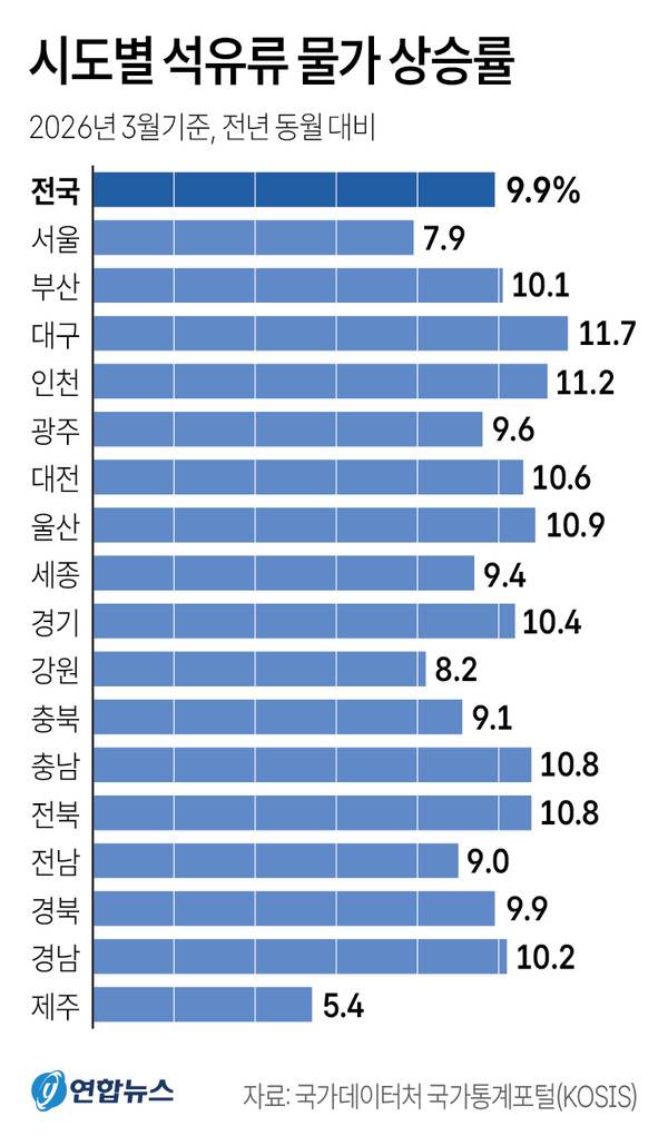 지난달 전국 석유류 물가 상승률은 9.9%를 기록했다. 충남·전북(10.8%), 대전(10.6%), 경기(10.4%), 경남(10.2%), 부산(10.1%) 등도 10%대 상승률을 나타냈다.