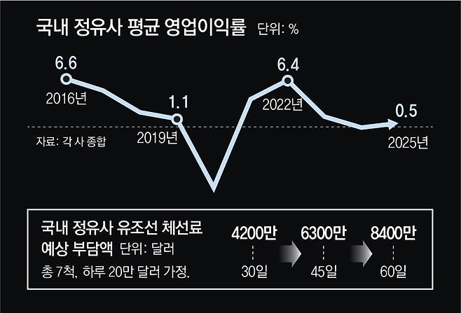 호르무즈 해협 안에 갇혀 돌아오지 못하는 유조선도 정유사들의 경영 불확실성을 키우고 있다. 현재 해협 안에는 국내 정유사 유조선 7척이 갇혀 있는데, 하루 체선료가 평시의 10배 수준인 20만 달러로 치솟았다. 현재 누적 부담액이 6000만 달러(약 800억 원)를 웃돌 것으로 보인다.