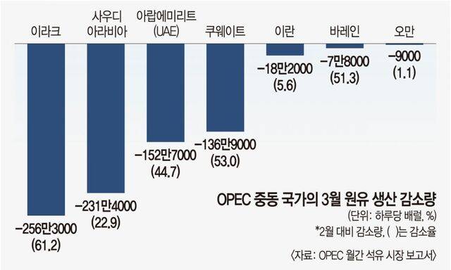 14일 OPEC 월간 보고서에 따르면 3월 기준 회원국 전체 산유량은 하루 2078만8000배럴로 집계됐다. 전월(2866만6000배럴)보다 787만8000배럴 감소한 수치로, 감소율은 27.5%에 이른다. 787만8000배럴은 한국의 하루 원유 소비량(약 280만 배럴)의 3배에 가까운 규모다. 코로나19 팬데믹 당시 OPEC과 주요 산유국들이 자발적 감산을 합의했던 980만 배럴과 비교해도 상당한 양이다.