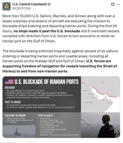 사령부는 "이 봉쇄는 아라비아만과 오만만에 위치한 모든 이란 항구를 포함하여, 이란 항구 및 연안 해역을 출입하는 모든 국가의 선박에 대해 차별 없이 적용되고 있다"고 했다.