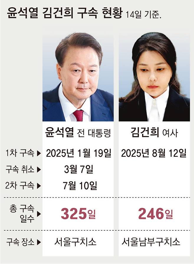 윤 전 대통령은 지난해 7월 10일 내란 특검(특별검사 조은석)에 의해 재구속됐고 김 여사는 지난해 8월 12일 구속됐다.