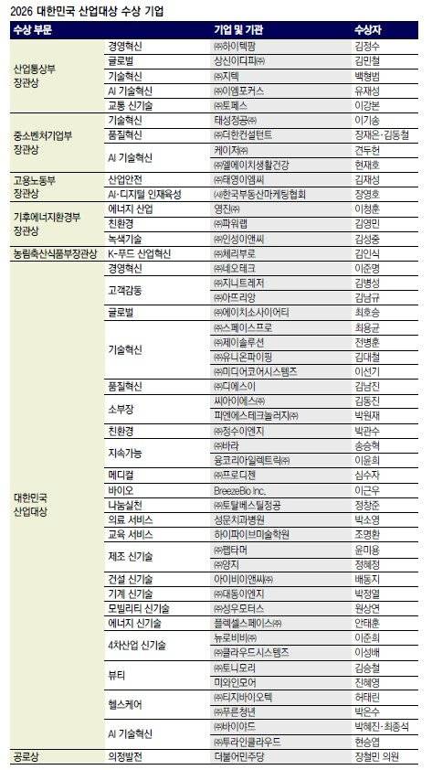 이번 ‘2026 대한민국 산업대상’은 슬로건 ‘실행에서 도약으로, 혁신에서 미래로’를 온몸으로 실천한 49개 기업 및 기관을 혁신 리더로 선정했다. 산업통상부·중소벤처기업부·고용노동부·기후에너지환경부·농림축산식품부 등 5개 부처 장관상과 대한민국 산업대상, 공로상을 아우르는 수상 기업들은 경영혁신·AI 기술혁신·친환경·바이오·헬스케어·모빌리티·뷰티 등 산업 전 스펙트럼에 걸쳐 탁월한 성과를 일궈냈다.