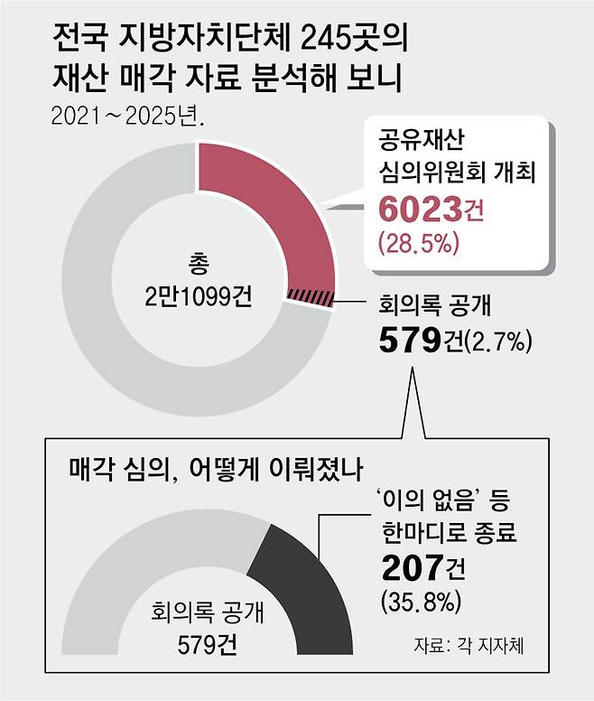 경기 성남시는 같은 기간 1조1855억 원어치 땅과 건물을 매각했으나 회의록은 한 건도 공개하지 않았다. 성남시 관계자는 “위원들 발언이 위축될 수 있다”는 이유를 댔다. 전북 전주시는 총 1016억 원 규모의 재산 320건을 매각하면서 “회의록 공개 규정이 없다”며 전체를 비공개했다.