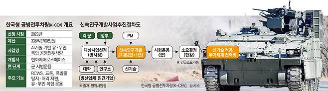 AI 기술 기반 유·무인 복합 ‘한국형 공병전투차량(K-CEV)’도 마찬가지다. 한화에어로스페이스가 연구개발사다. 연구개발 및 시범 운용을 위한 제품 소량 획득에 예산 338억원이 투입됐다. 현재 육군 제11기동사단에서 시범 운용 중이다. 공병 병과 전문가들은 K-CEV가 신속시범사업의 취지에 부합하는지 의문을 제기한다. K21 보병전투차량(IFV) 하부체계에 원격사격통제체계(RCWS)와 폭발물 탐지 로봇 등 기존 장비를 결합한 수준에 가깝다는 것이다. 공병의 본래 임무는 지뢰지대와 장애물, 폭발물 제거를 통한 기동로 확보다. 개별 폭발물 처리용 로봇과 적 탐지·교전 기능을 결합한 현재의 구성은 공병보다는 보병 전투 지원에 치우쳐 있다는 반응도 나왔다.