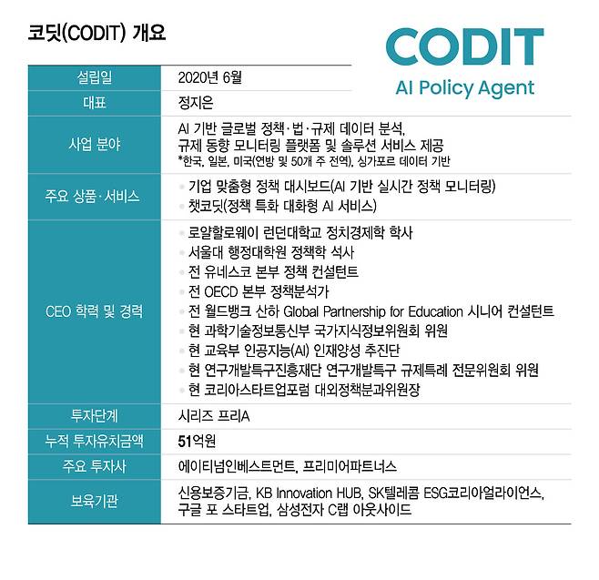 코딧의 차별성은 기존 법률 AI 서비스와도 분명하게 드러난다. 기존 서비스가 판례 검색이나 계약서 검토 등 법률 실무에 초점을 맞춘다면 코딧은 정책과 규제의 흐름 자체를 분석하는 데 집중한다. 정 대표는 "코딧은 과거 데이터를 분석하는 것이 아니라 앞으로 기업에 영향을 미칠 정책 변화를 추적하는 서비스"라고 강조했다.