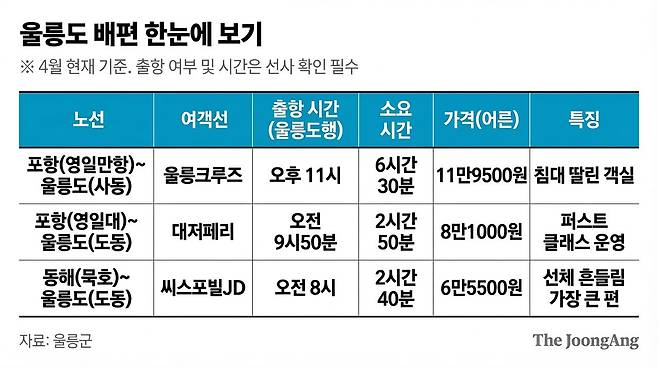 경북 포항 여객선 터미널과 영일만항, 강원도 동해 묵호항에서 울릉도행 배가 뜬다. 후포항(울진), 강릉항(강릉)에서 출발하는 여객선은 지난해 운항을 멈췄다. 여객선마다 가격, 소요 시간, 특징이 다르다. 4월 현재 울릉도 렌터카 요금은 SUV 기준 하루 9만원 선이다. 패키지 단체여행객이 몰리는 도동은 여전히 혼밥이 안 되는 식당이 많다. 저동·사동 등 다른 지역에서는 1인 식사가 어렵지 않다. 울릉공항은 2028년 개항 예정이다.