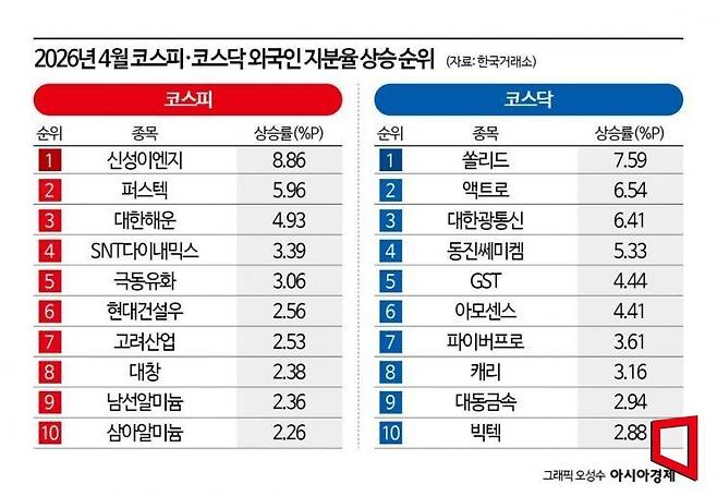 15일 한국거래소에 따르면 이달 들어 코스피 시장에서 외국인 지분율이 가장 크게 상승한 종목은 신성이엔지(8.86%포인트)였다. 이어 퍼스텍(5.96%포인트), 대한해운(4.93%포인트), SNT다이내믹스(3.39%포인트), 극동유화(3.06%포인트) 등이 상위권을 차지했다.